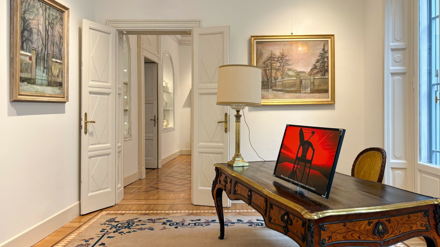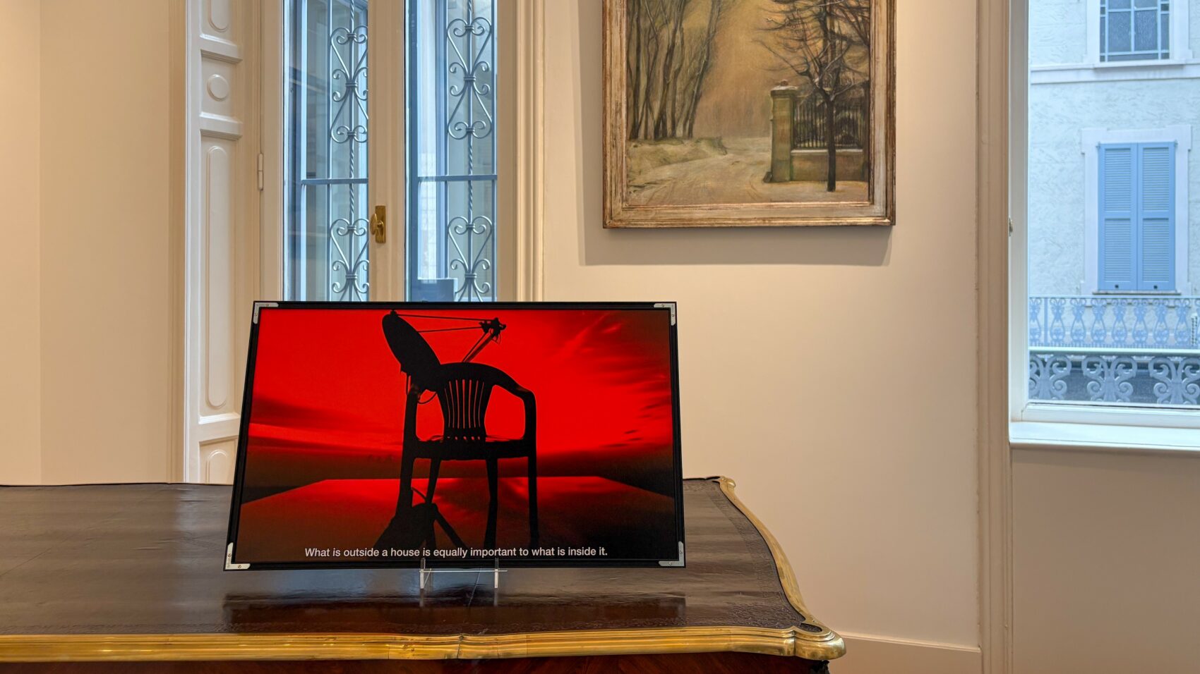 Unpredictable Homes (2026) espande il tema mettendo in dialogo gli interni domestici con i contesti spaziali esterni attraverso la frase, che suona come un monito: “What is outside a house is equally important to what is inside it”. Una sedia e un’antenna si stagliano in un paesaggio rosso fuoco: la prima si configura come una soglia instabile, elemento minimo dell’abitare che evoca la presenza umana pur nella sua assenza; la seconda agisce come indicatore esterno dell’abitare, segnalando una vita in atto e una connessione costante con reti invisibili. In questa tensione tra interno ed esterno, tra corpo e infrastruttura, il lavoro porta all’attenzione le risorse materiali e simboliche necessarie a sostenere e riprodurre la vita, tanto nella dimensione privata quanto in quella collettiva.