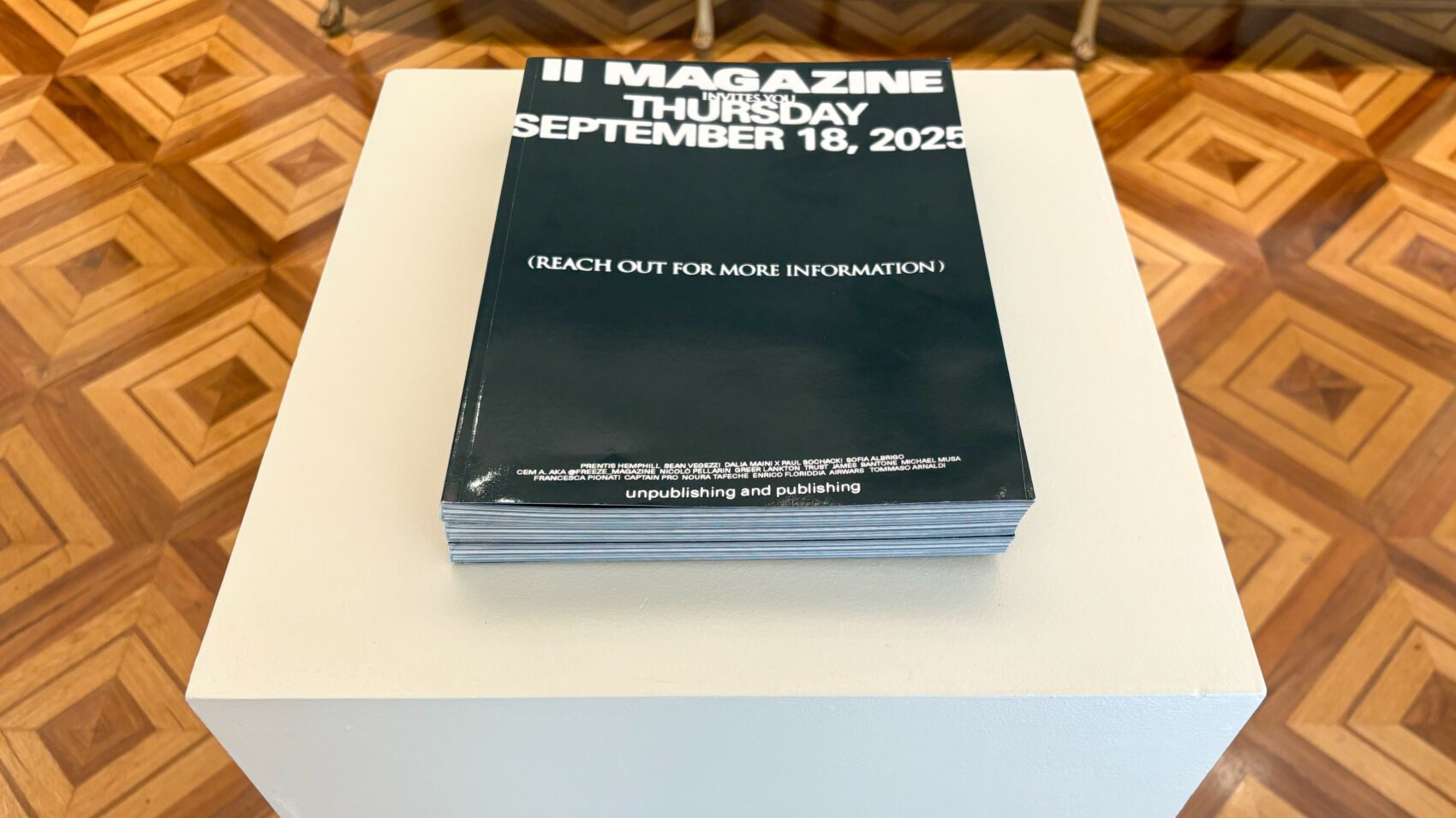 A completare l’intervento sono i due numeri della rivista annuale II Magazine, co-fondata a Roma nel 2022, di cui Pionati è caporedattore mentre Arnaldi direttore creativo. Il progetto analizza criticamente le gerarchie e i pregiudizi sistemici che regolano ciò che viene reso visibile, diffuso o archiviato, ridefinendo i confini del discorso editoriale contemporaneo.
