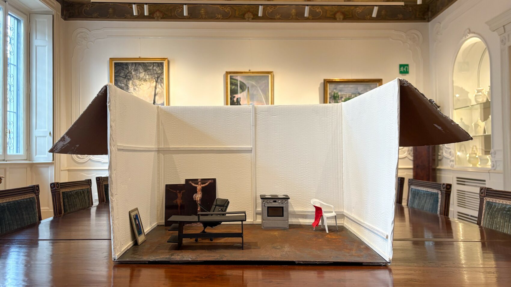 Francesca Pionati e Tommaso Arnaldi presentano un intervento site-specific nelle sale del primo piano della Fondazione, capace di mettere in relazione, in chiave simbolica, i temi della loro ricerca sulle abitazioni informali e temporanee con i dipinti e gli oggetti d’arte della casa-studio del pittore Renzo Bongiovanni Radice (1899–1970).